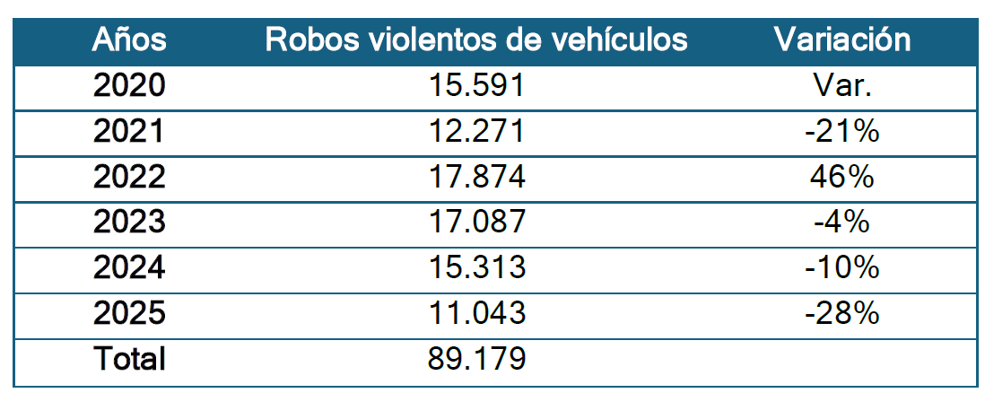 La División de Estudios, Evaluación, Control y Desarrollo de la Gestión (DIVEST) de la Fiscalía Nacional dio a conocer el Informe de Robo Violento de Vehículos, reporte N°5 de fenómenos criminales, donde por primera vez se utilizó inteligencia artificial para leer masivamente relatos policiales del Sistema de Apoyo a Fiscales (SAF). El Informe analizó el período 2020 – 2025 y abarca un total de 89.179 casos, alcanzando un peak en 2022 de 17.874 y su cifra más baja en 2025 con 11.043 casos, un 28% que el año 2024.