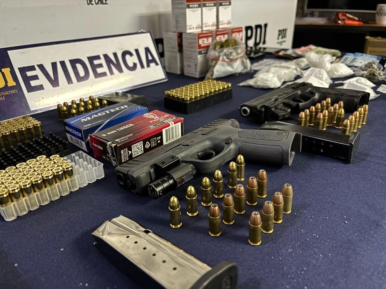 Posteriormente la PDI encontró en la vivienda de O.Z.C., otros 995 cartuchos de municiones, entre ellos 100 de los “mata policías”, además de un cargador con 10 cartuchos y un frasco con 22 gramos de ketamina. En tanto, en el domicilio del coimputado N.G.M., se halló una pistola, un cargador con 11 cartuchos, cinco municiones pertenecientes a Carabineros; además de diversas bolsas con un total de 196 gramos de clorhidrato de cocaína, y ocho frascos con ketamina.